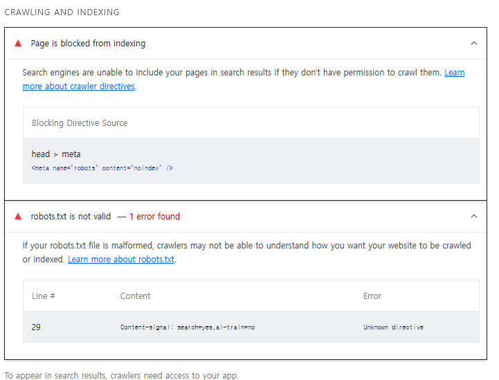 영어를 잘 하진 못하지만 해석을 해보자면 인덱스 코드의 헤드 > 메타 태그에 크롤링을 하지 못하도록 막아놓는 설정이 있는데 이를 막아놨다고 합니다.